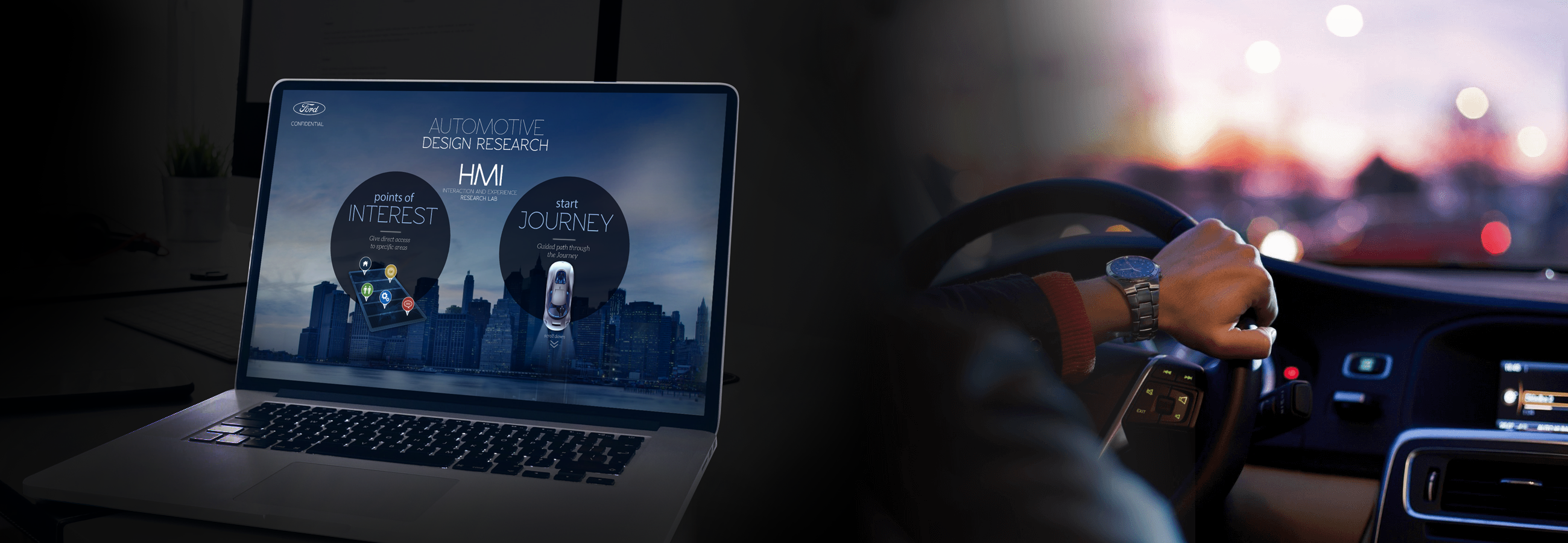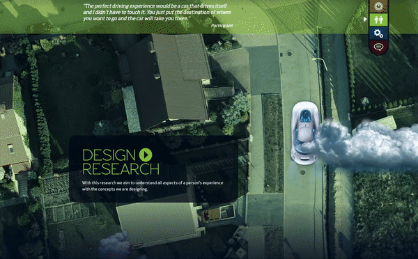 Our team was exploring what was not yet a reality in the current automotive experience, and the design and research teams worked hand in hand to discover and create concepts. We started by conducting experience research to quickly immerse ourselves in a new car driving experience to discover what makes a great driving experience, what kinds of relationships people have with their cars, and investigate different design directions of interest that could be further explored and brought to life.