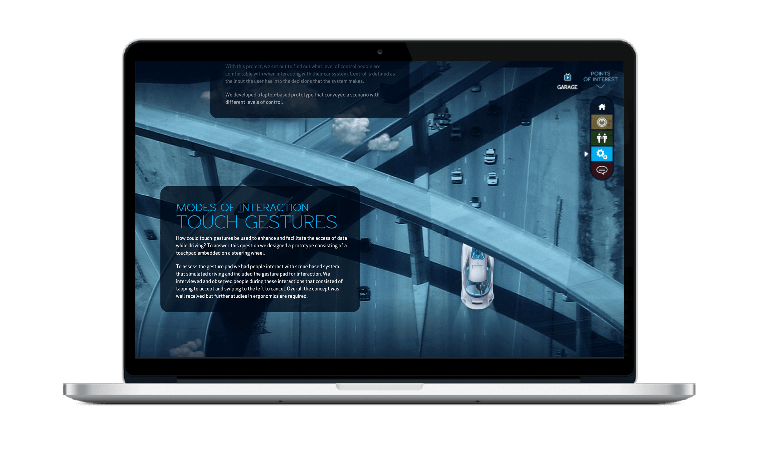 Our team was exploring what was not yet a reality in the current automotive experience, and the design and research teams worked hand in hand to discover and create concepts. We started by conducting experience research to quickly immerse ourselves in a new car driving experience to discover what makes a great driving experience, what kinds of relationships people have with their cars, and investigate different design directions of interest that could be further explored and brought to life.