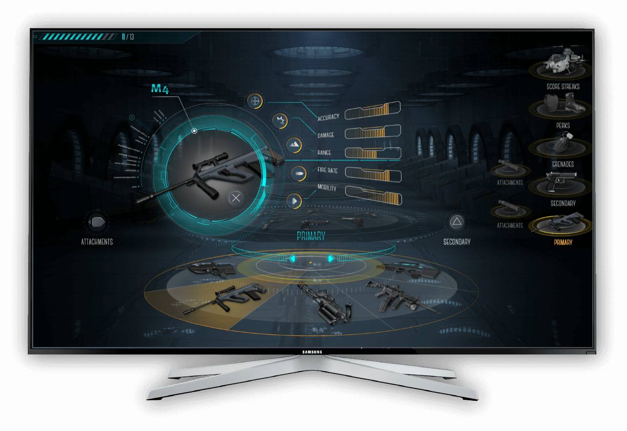 Our goal was to increase ease of use, ease of learning and enhance the overall gameplay experience. To better understand how this could be done, we entered a discovery phase to investigate past Call of Duty titles’ user interfaces and menu systems. Several menu and shooter configuration concepts were then developed that focused on a preview-centric approach and introduced the notion of left and right controls for navigation.